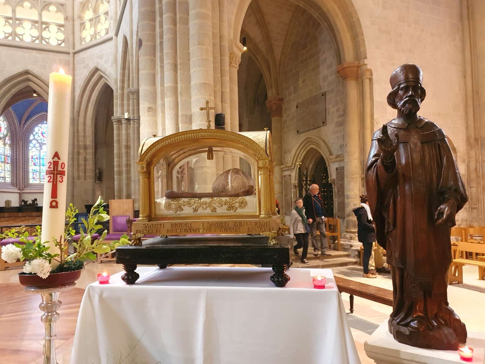 Les reliques de saint Brieuc et saint Guillaume ont été encensées en début de célébration. « Saint Brieuc veille sur nous, enflamme nos cœurs du feu de ton amour pour le Christ et pour les hommes, afin que nous soyons témoins des merveilles que Dieu accomplit pour nous. Lui qui, par son Fils Jésus a pris chair de notre chair, est mort et ressuscité pour que nous demeurions en lui maintenant et pour les siècles des siècles. »