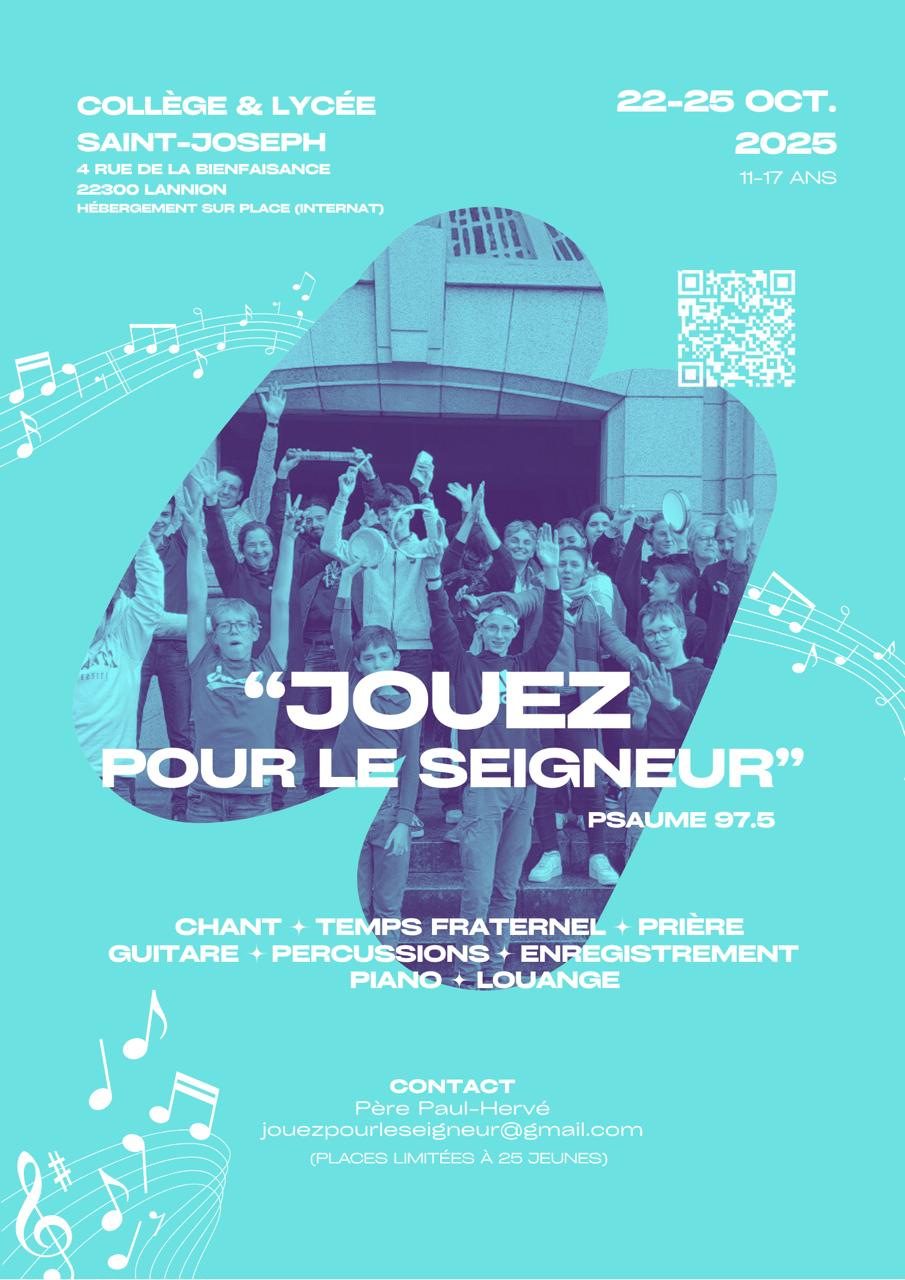 Du 22 au 25 octobre 2025, les jeunes âgés de 11 à 17 ans sont invités à participer à la session « Jouez pour le Seigneur » au collège-lycée Saint-Joseph de Lannion (4 rue de la Bienfaisance). Au programme : chant, temps fraternel, prière, guitare, percussions, enregistrement piano, louange…