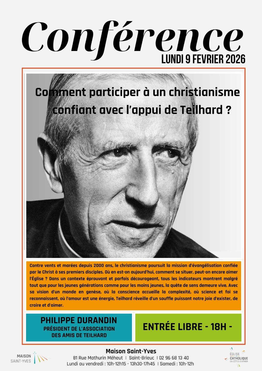 Conférence lundi 9 février 2026 à 18h sur le thème « Comment participer à un christianisme confiant avec l’appui de Teilhard ? » en présence Philippe Durandin, président de l’association des Amis de Teilhard de Chardin.