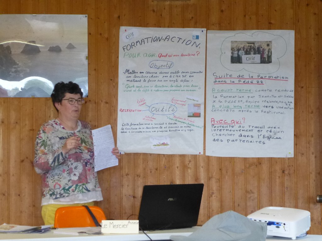 Annie a ouvert la rencontre en rappelant la dynamique « d’aller vers »,« sortir de l’entre soi », que le CMR national a impulsée depuis quelques temps, la ligne conductrice de « mieux connaître nos territoires ruraux pour s’ impliquer ». Avec à court terme la perspective d’un événement rassembleur dans le Cantal, et à moyen terme l’ambition de nourrir nos implications citoyennes locales. La formation/action qui a suivi, sur le thème « pour agir, quel est mon territoire ? », a réuni une vingtaine d’autres participants du grand ouest, l’occasion de présenter les projets qui pourraient être envisagés après en Côtes d’Armor.